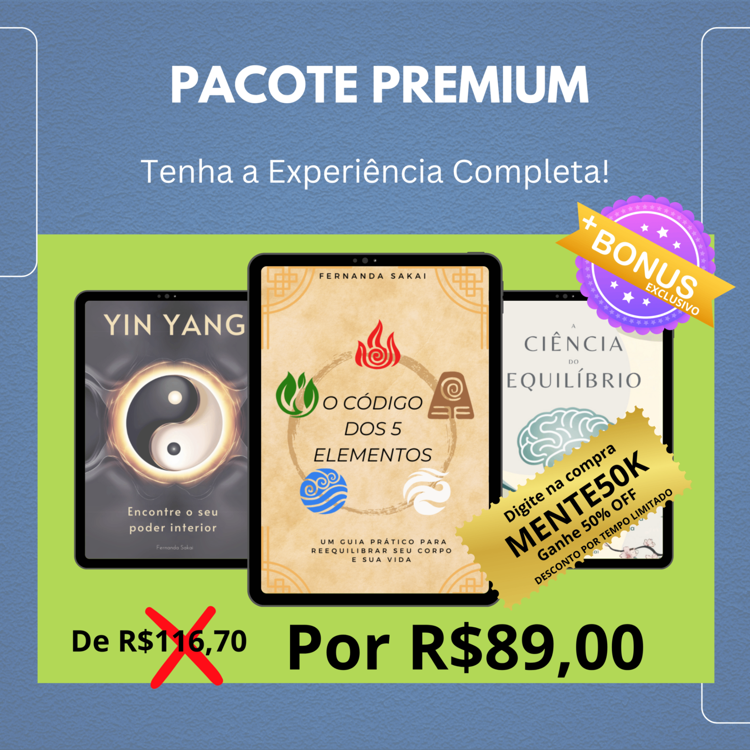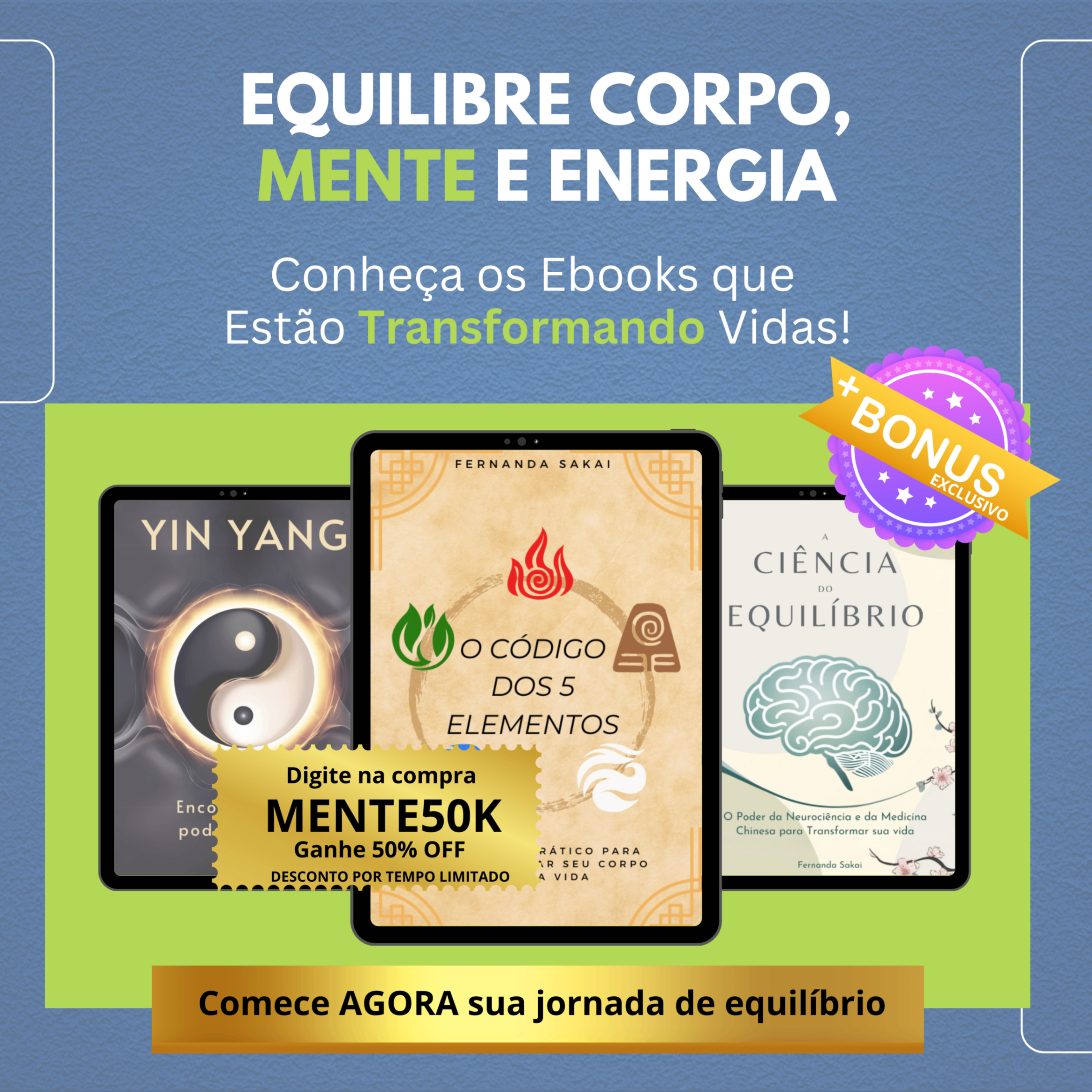 Com os eBooks 'Yin Yang', 'O Código dos 5 Elementos' e 'A Ciência do Equilíbrio', você terá acesso a uma abordagem completa, que une Sabedoria Milenar e Ciência Moderna. Dê o primeiro passo para identificar desequilíbrios, reprogramar padrões emocionais e restaurar sua energia. Sua jornada rumo ao equilíbrio começa aqui. A hora de agir é agora!
